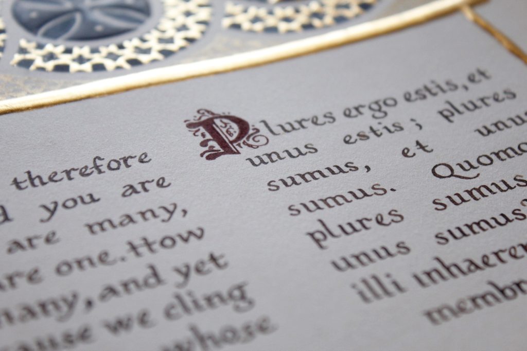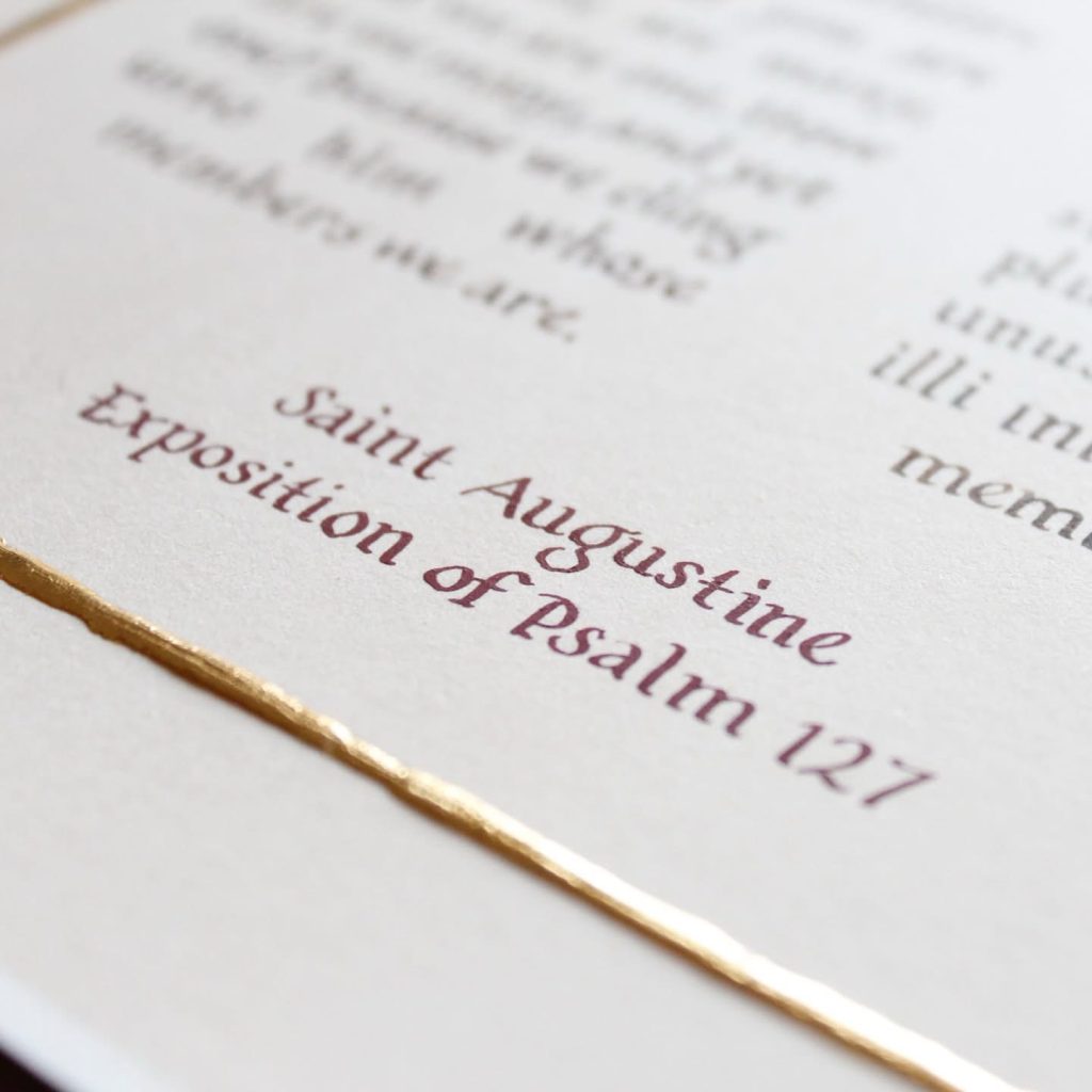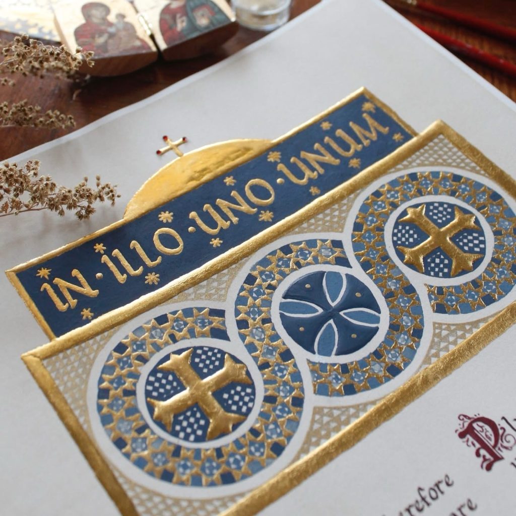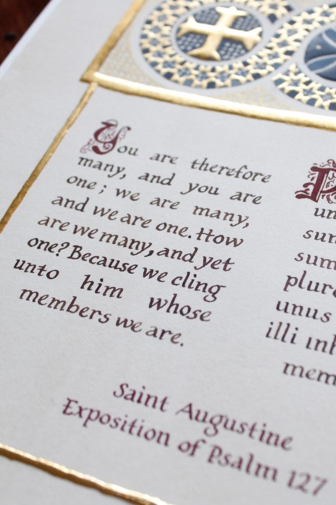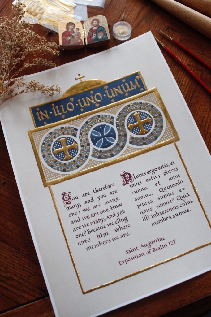 At the center of the manuscript is Pope Leo XIV’s papal motto: “In Illo Uno Unum” — “In the One we are one” — The text includes a powerful excerpt from Saint Augustine’s Exposition on Psalm 127: