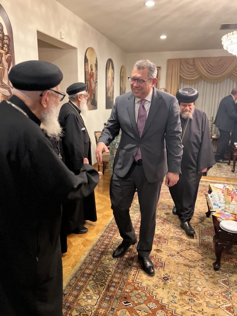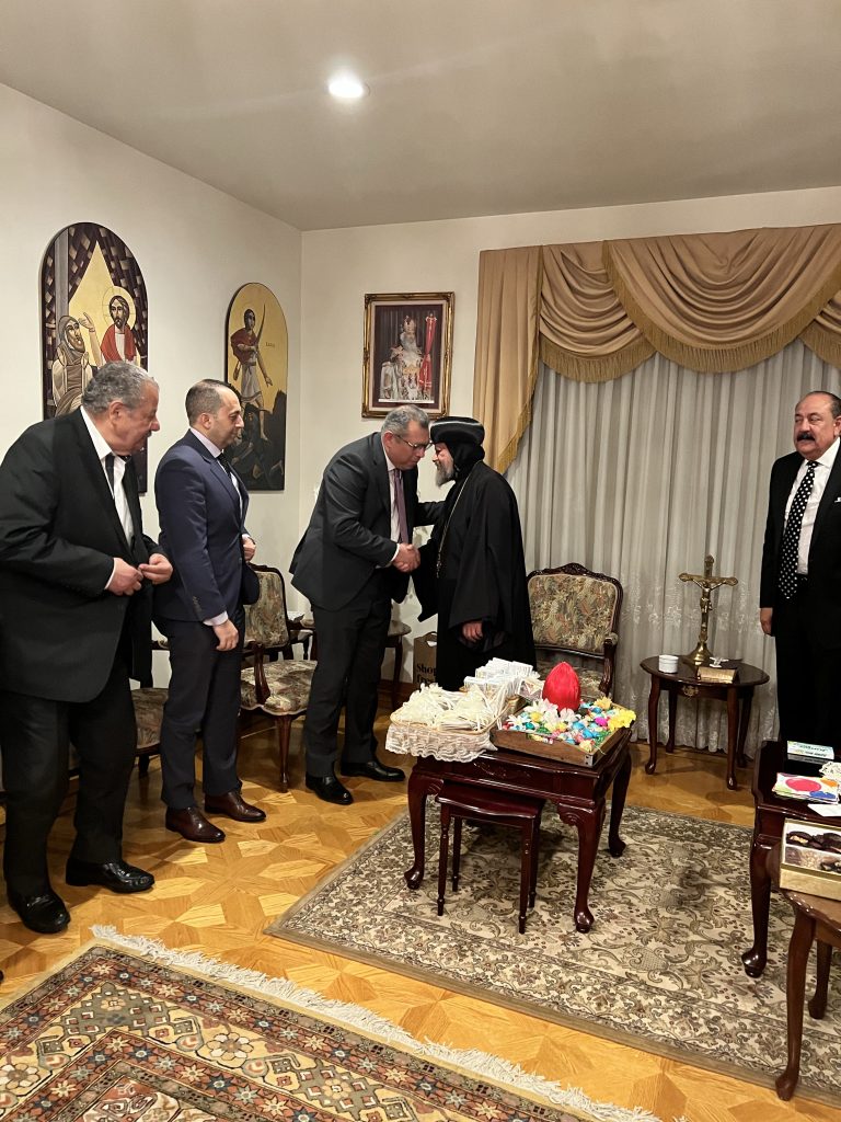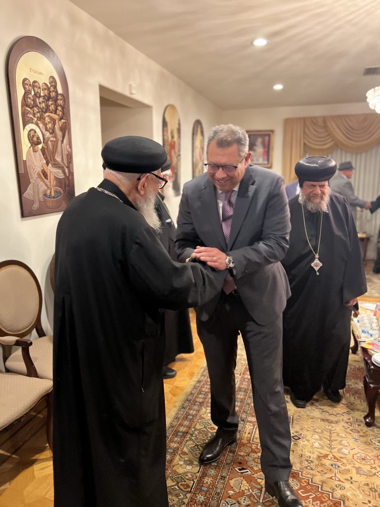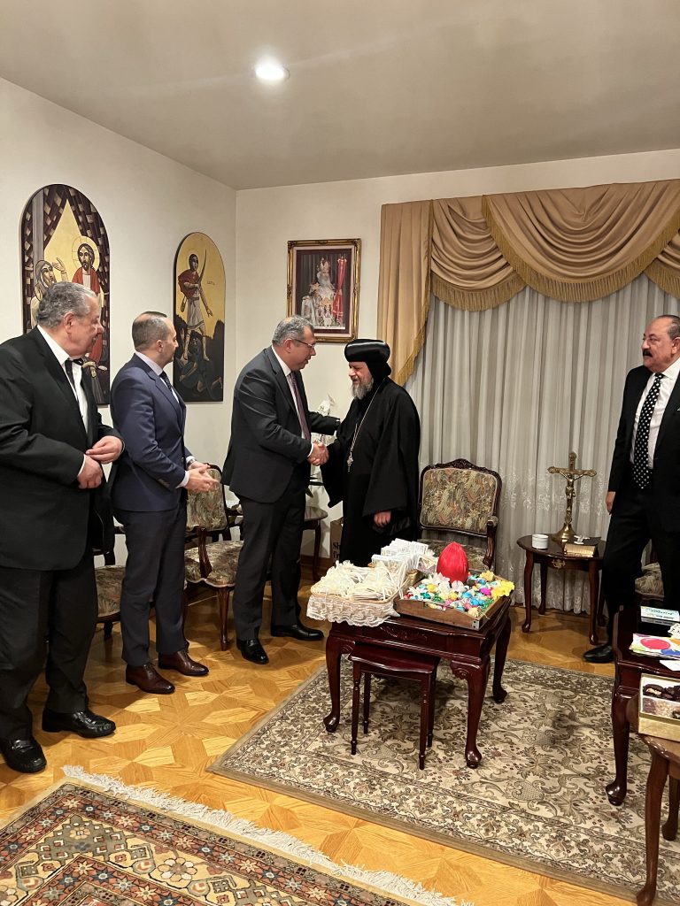 On Sunday April 16, 2023, His Eminence Metropolitan Serapion accompanied by His Grace Bishop Abraham and His Grace Bishop Kyrillos received His Excellency Ambassador Ahamed Shaheen, Consul General of the Arab Republic of Egypt in Los Angeles and with him His Excellency Counselor Mohamed Taher, Deputy Ambassador and in the presence of members of the General Union of Egyptians Abroad to wish His Eminence and their Graces a Blessed Feast of the Resurrection at the Dioceses Residence in LA.