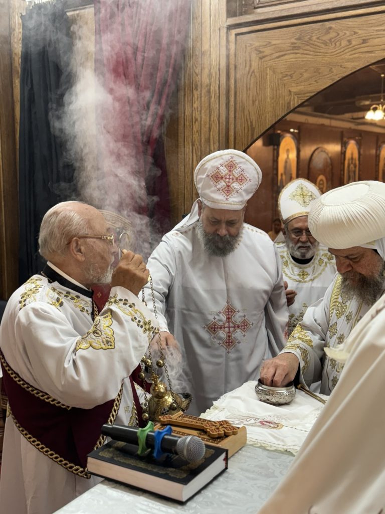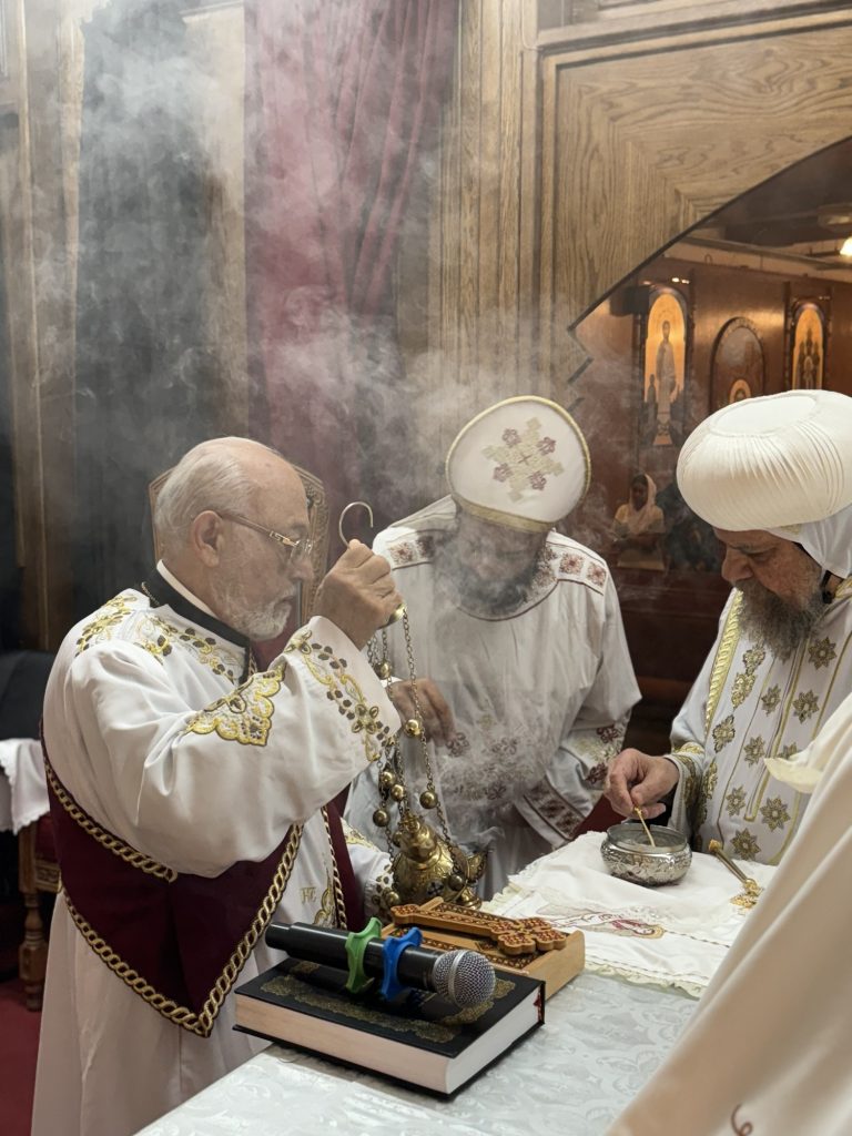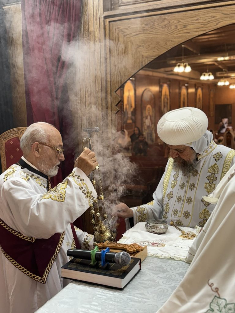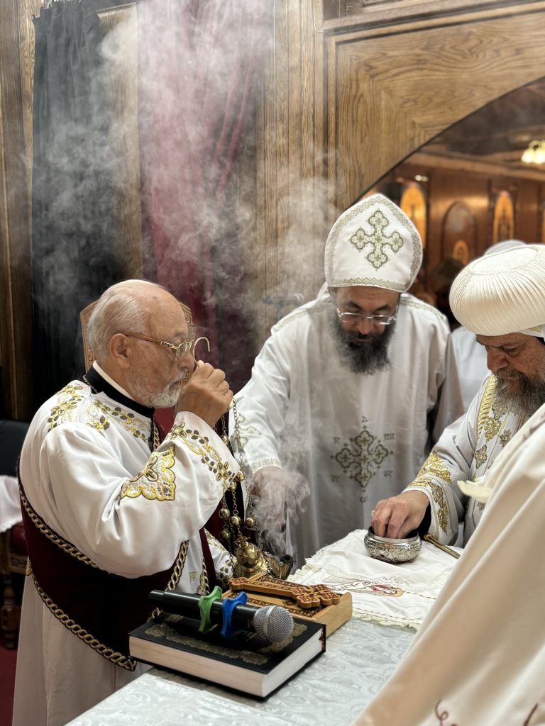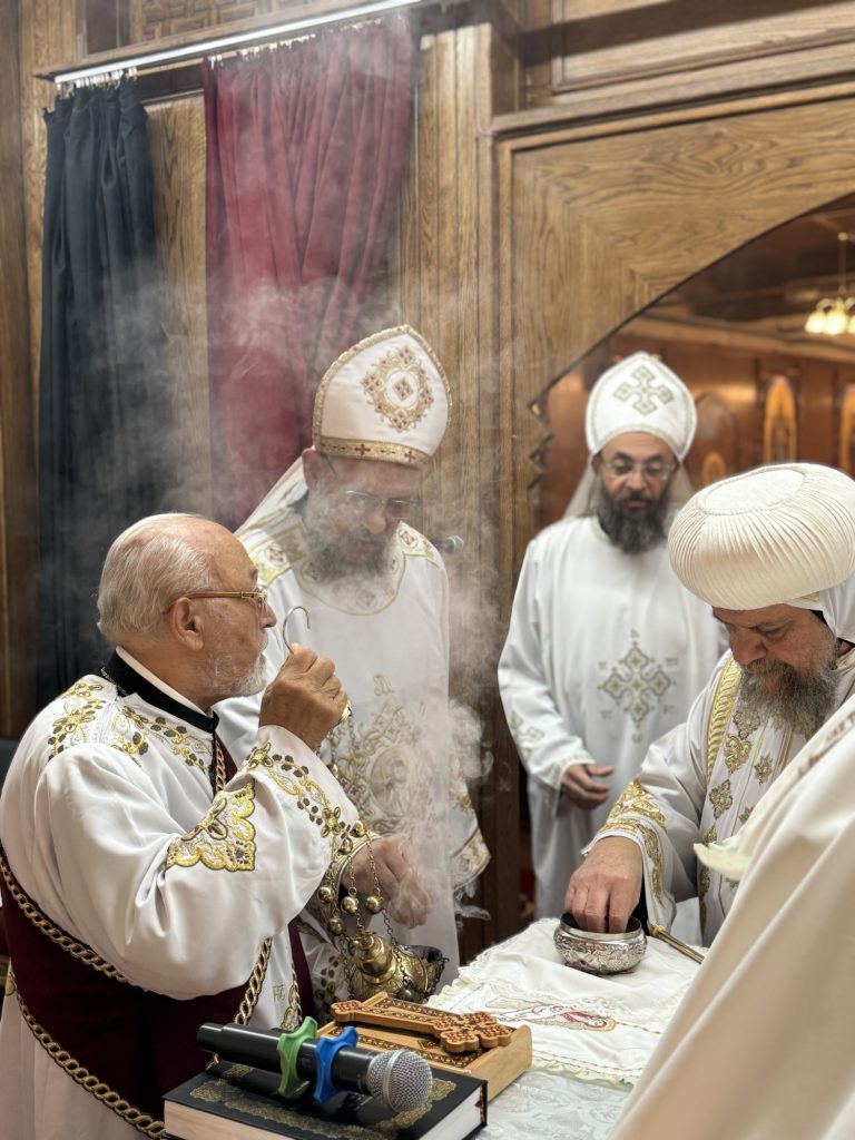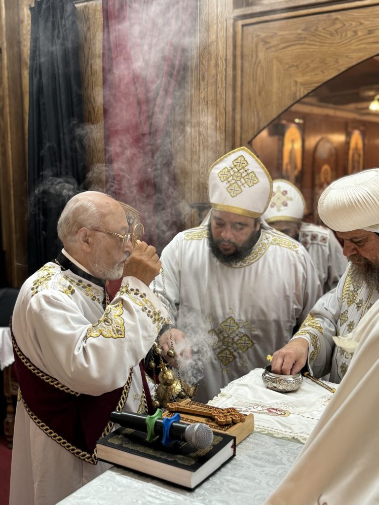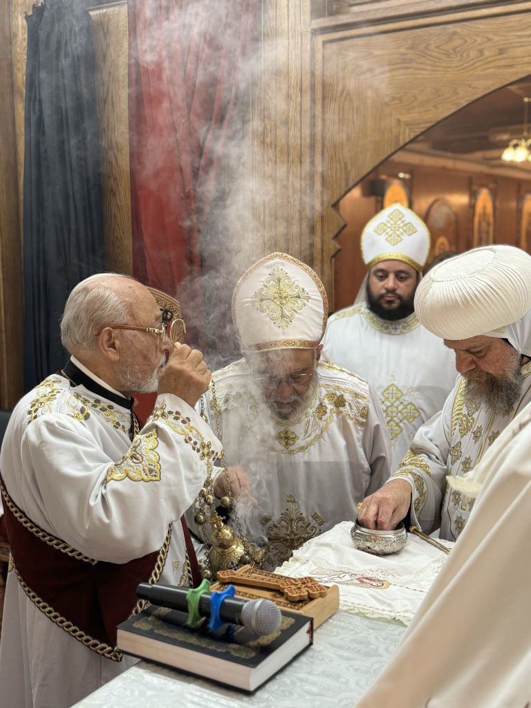 Participated in the Divine Liturgy were Hegumens: Fr. Bishoy Kamel, Fr. Bishoy Ray, Presbyters: Fr. Mark Hanna, Fr. Mina Ghebrial, Fr. Youssef Zaki, Fr. Michael Fanous, Fr. Kyrillos Fam, and Fr. Jeremaiah Said, Archdeacon Botros Botros, Archdeacon Kyrillos Beshara, and Deacon Mina Zakhary.