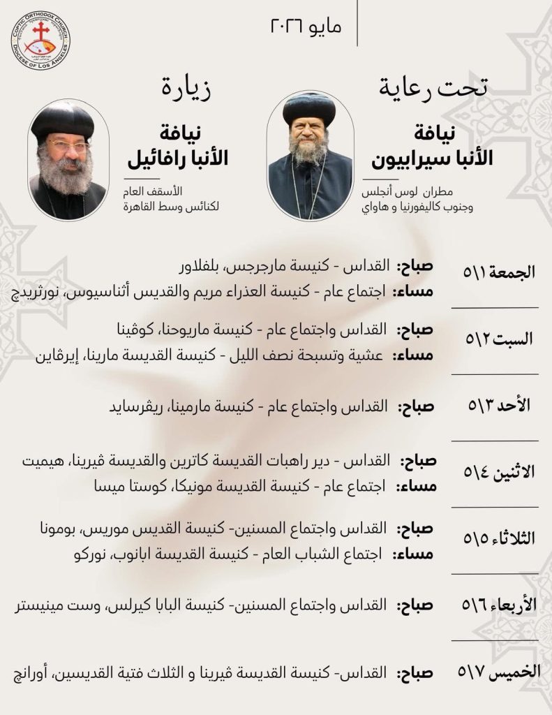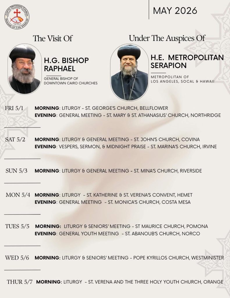 Under the Auspices of His Eminence Metropolitan Serapion, The Pastrol Visit of His Grace Bishop Raphael to The Coptic Orthodox Diocese of Los Angeles, Southern California, And Hawaii.