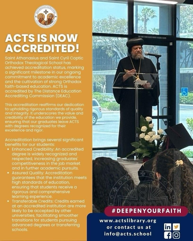 By the Grace of God, the prayers of the saints, and our dedicated board, faculty, and staff Saint Athanasius and Saint Cyril Coptic Orthodox Theological School has just achieved accreditation status by the Distance Education Accrediting Commission (DEAC)! This marks a significant milestone in our ongoing commitment to academic excellence and the cultivation of strong Orthodox faith-based education.