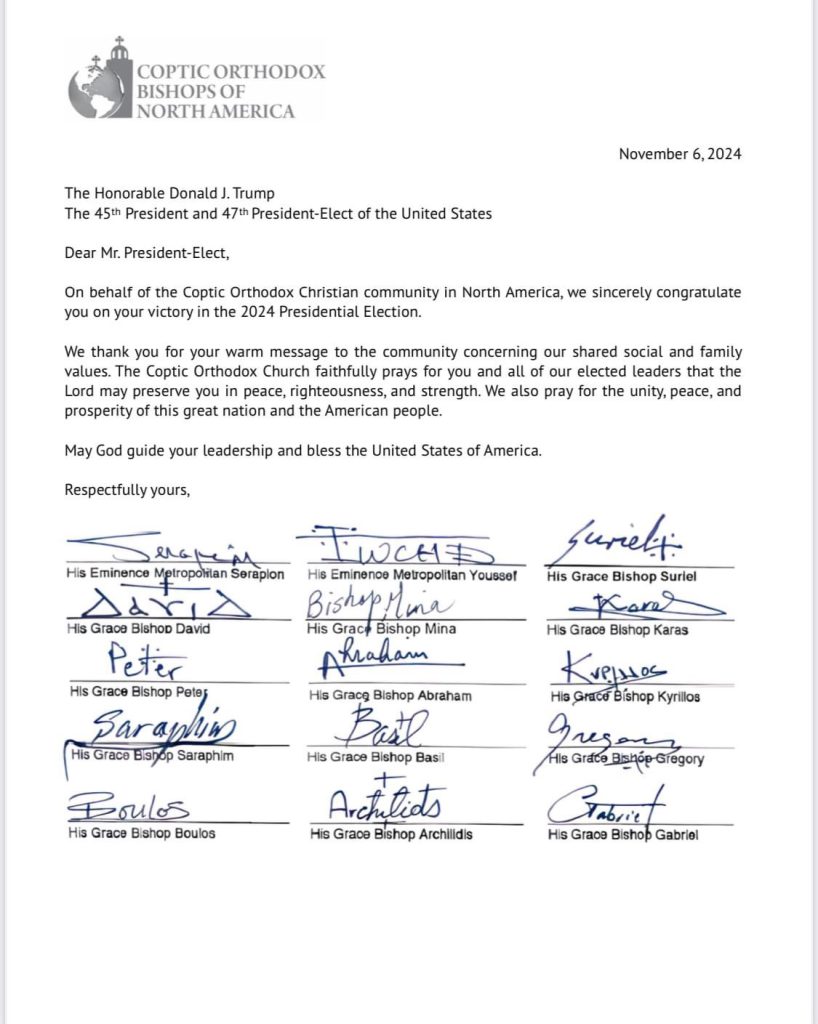 On behalf of the Coptic Orthodox Christian community in North America, we sincerely congratulate you on your victory in the 2024 Presidential Election.