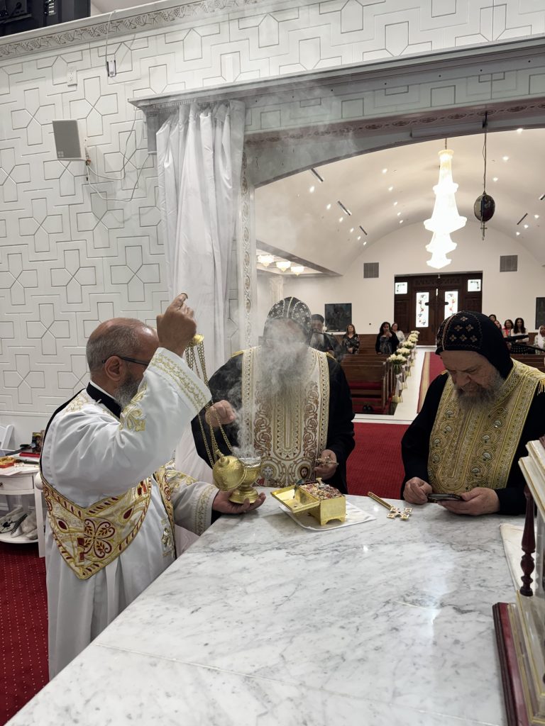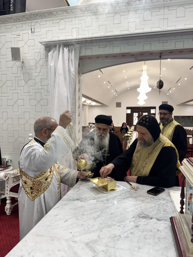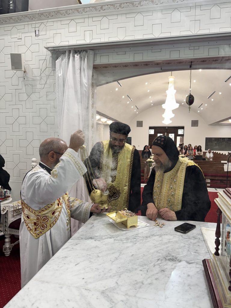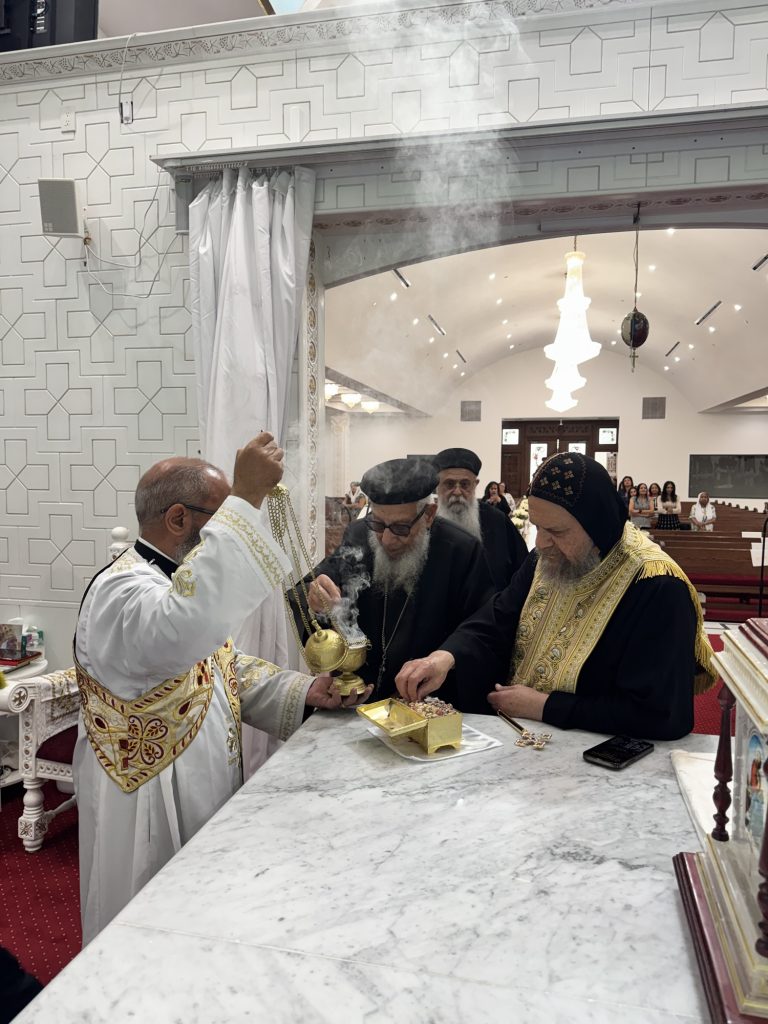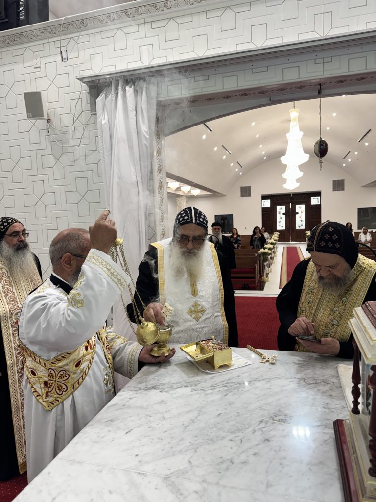 Participated in the consecration prayers were Hegumens: Fr. Gawargious Kolta, Fr. Shenouda Ghattas, Fr. Markos Hanna, Presbyters: Fr. Jeremiah Said, Fr. Antonious Sadek, and Deacon: Bishoy Tadros.